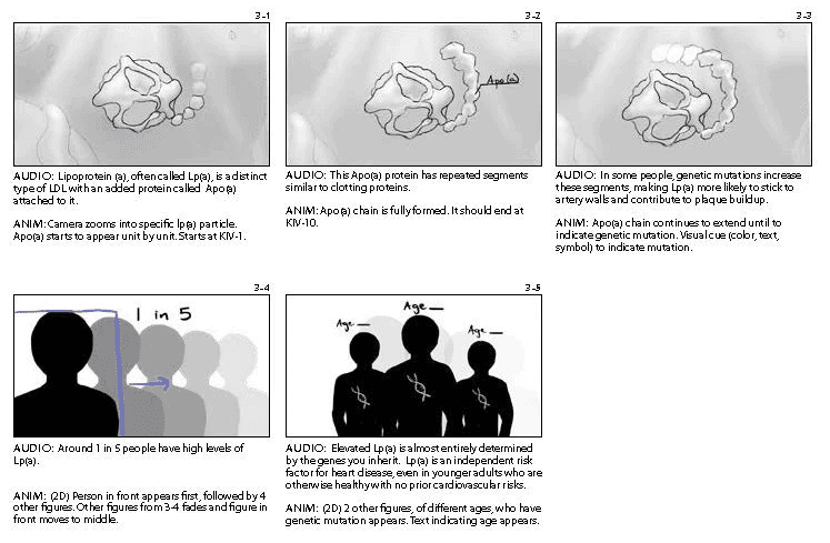 Based on the mood board and concept art from my team, I drafted a section of the story board using Procreate and Adobe Indesign. These frames demonstrate the difference between LDL and LPa as well as the statistics of people with LPa.